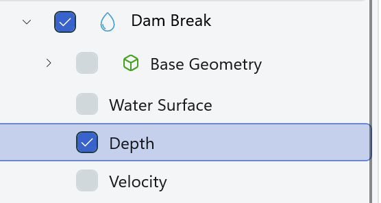 Result mapping should be familiar to anyone who has used the animation tools in RAS Mapper in version 6. To visualize results, enable and select the desired map-type under the result. The animation bar at the top of the window reacts to your selected layer. To change mapping timesteps, click and drag.