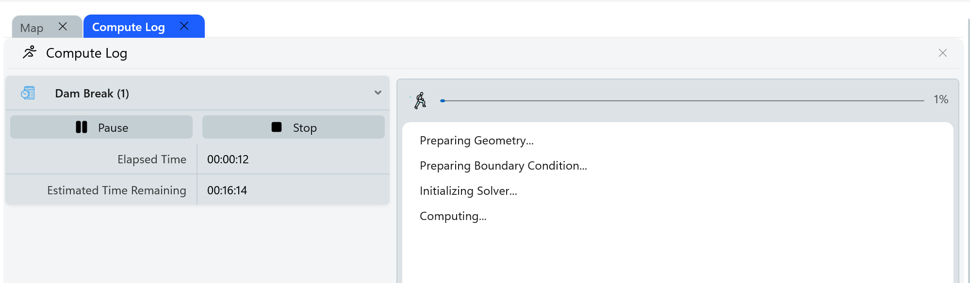To compute the plan, make sure you have it selected in the tree. The Primary Action Bar and Components pane will both have a Compute button. Click this button to start a run. The software is fully usable while the model is running. When you click Compute, the Compute Log docks in front of the map window.