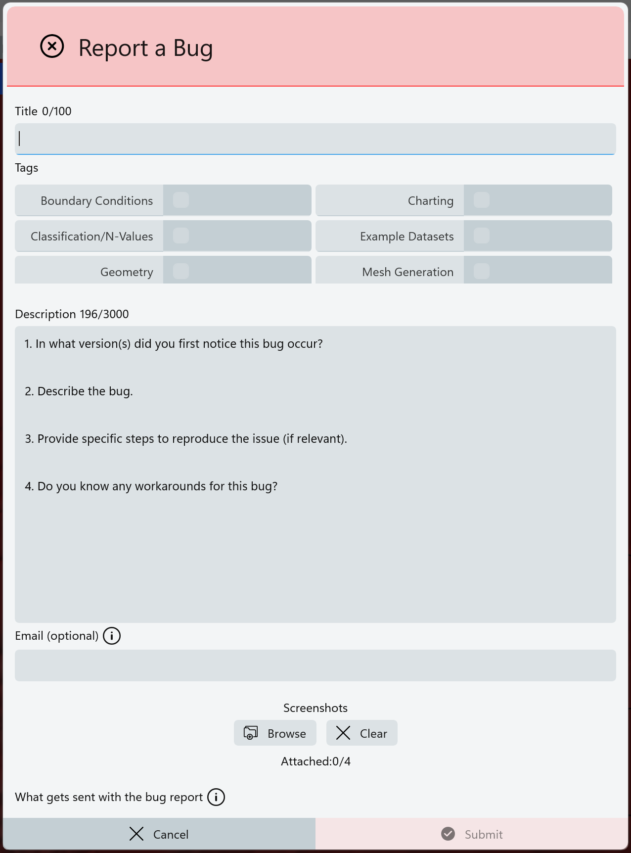- Geometry: If you select the 'Geometry' tag for the bug report, RAS enables an additional drop-down that allows you to upload 1 Geometry file that reproduces the issue. RAS saves and uploads a backup of this geometry file, which just contains the wireframe Conceptual Mesh. This is very helpful for us to reproduce mesh generation issues, so thanks in advance for including these!