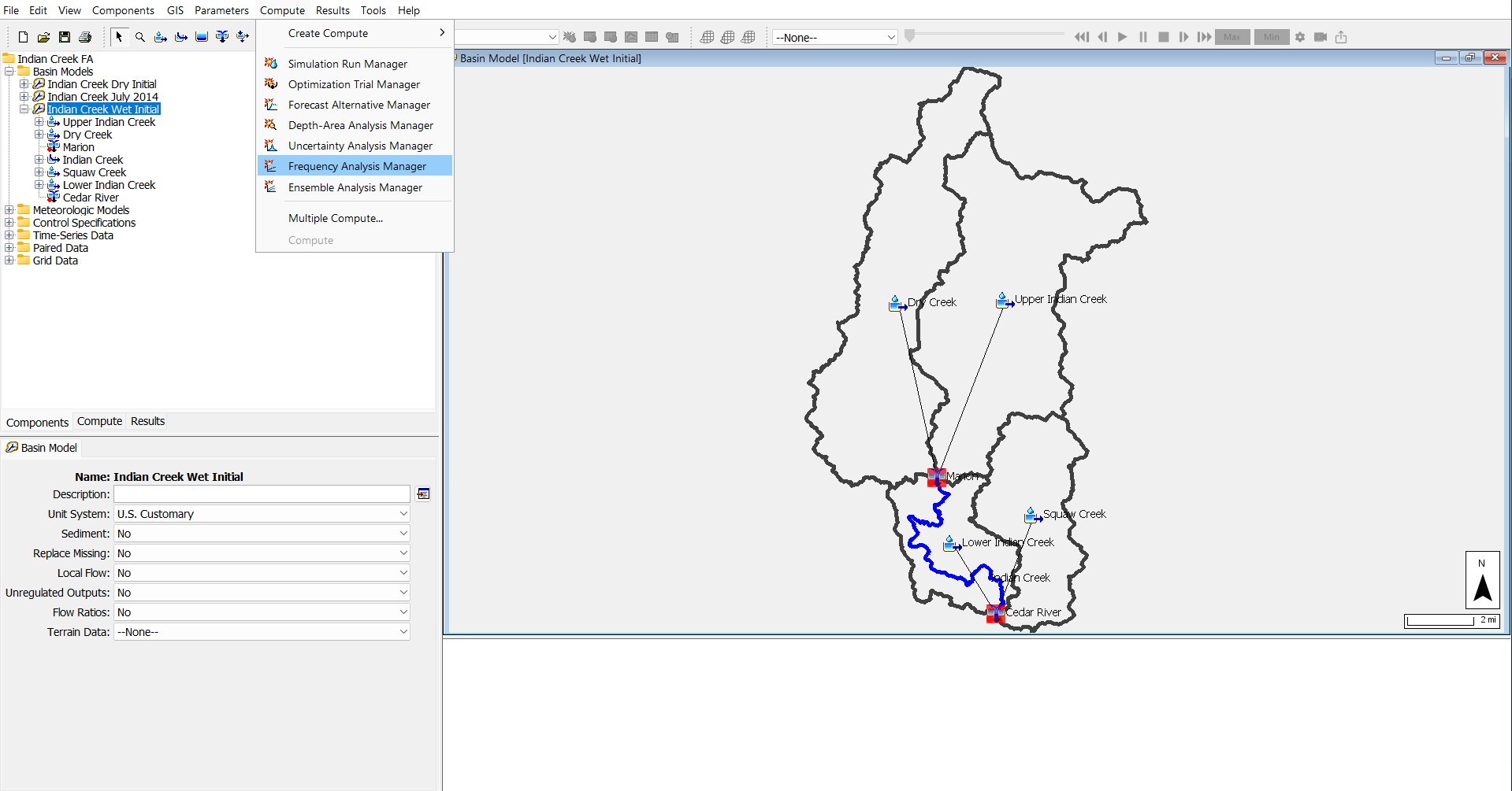 In this tutorial, you will learn how to apply the Frequency Analysis compute option which became available in HEC-HMS v4.10. You will 1) use the Frequency Analysis Manager to create a new Frequency Analysis compute. You will then learn how to 2) add ordinates to the new compute, and 3) compare the computed frequency results to an "observed" frequency curve from a separate Bulletin 17C analysis.
