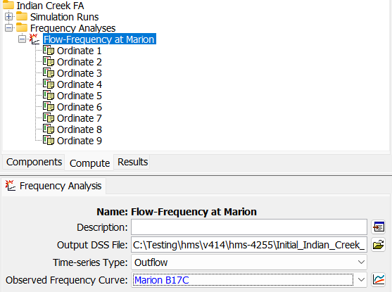 - Navigate to the watershed explorer, Compute tab and select the Flow-Frequency at Marion node. For Observed Frequency Curve, select the Marion B17C paired data object that you just created. Save your project.
