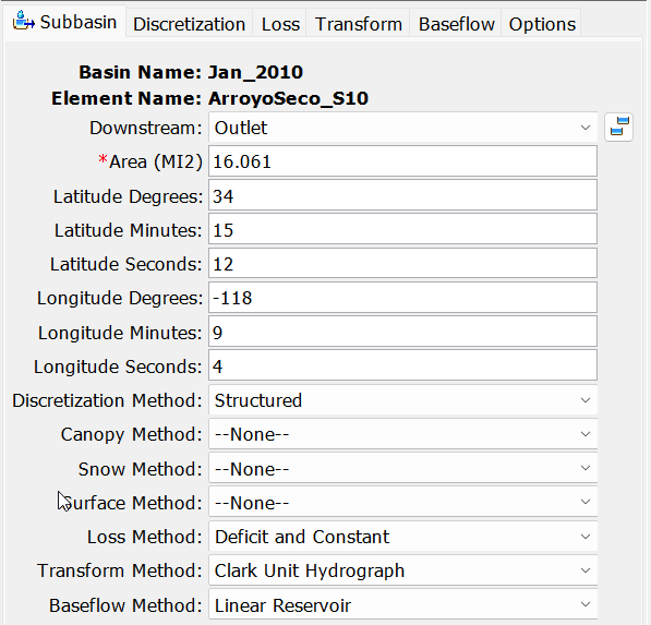 The Subbasin tab describes the model structure and selected model methods. Make sure your selected methods are the same as the figure below.