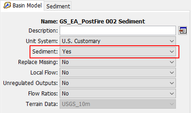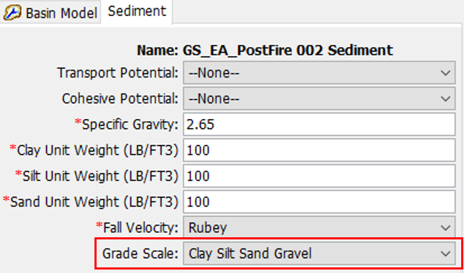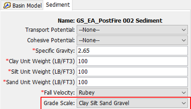 - When sediment simulations are toggled on (selection of Yes under the Sediment tab when the basin is selected) there will be two types of grade scale that can be selected under the Sediment tab: Clay Silt Sand Gravel or AGU 20. The selected grade scale controls how many grain size classes are utilized in the sediment simulations.
