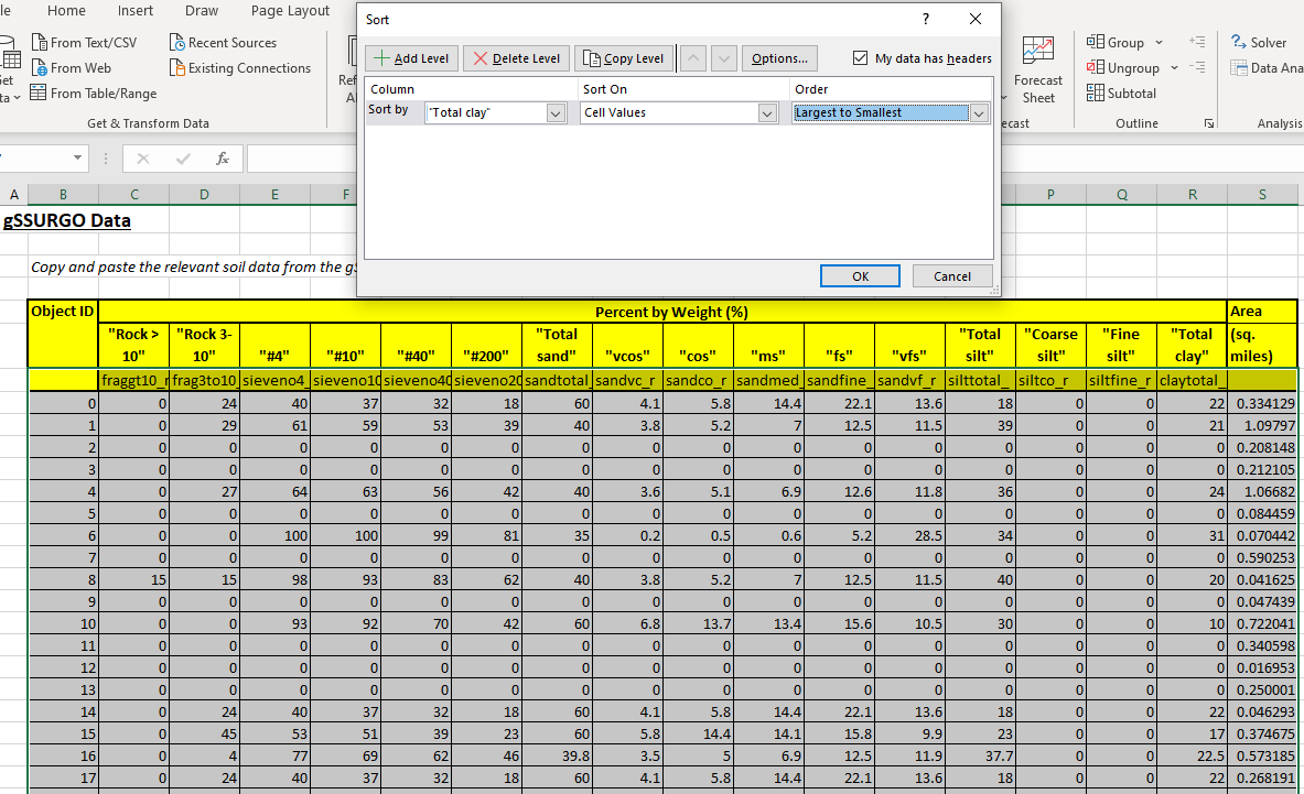 - Sort the data so that the rows containing soil data are listed before the rows that are missing soil data. Sort the data using the Total Clay column, see below. This will make the calculations in the next step simpler.