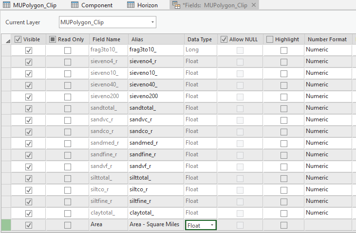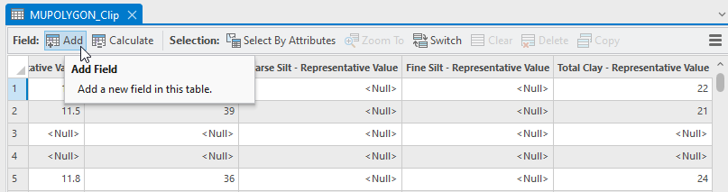 - Click Save in the ribbon at the top of ArcGIS Pro (the Fields ribbon). Then, the add field box can be closed. The Area - Square Miles field will show up in the MUPolygon_Clip attribute table.