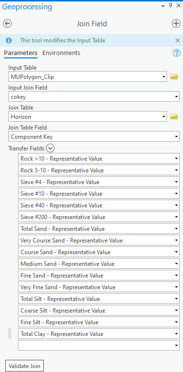 - With the first join completed, use the Join Field data management tool (Data Management Tools | Joins | Join Field) to join the data of interest from the CHORIZON table to the MUPolygon_Clip layer.