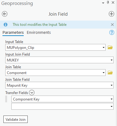 - Use the Join Field data management tool (Data Management Tools | Joins | Join Field) to join the COKEY attribute column from the Component table to the MUPolygon_Clip layer.