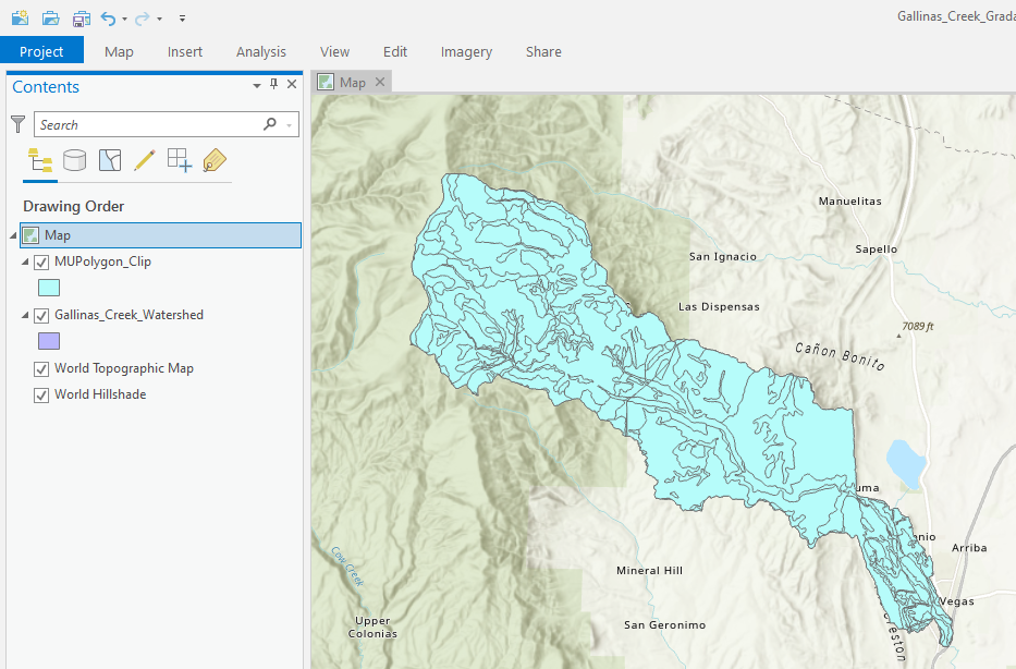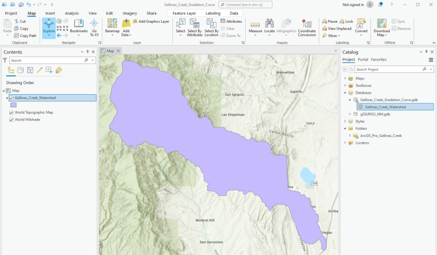 - Add the Gallinas_Creek_Watershed shapefile, located in the Gallinas_Creek_Gradation_Curve geodatabase, to the map.