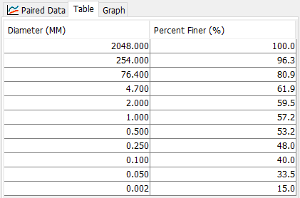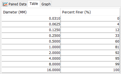 - For units, select MM: % Finer. Note: This is chosen since gradation curves tend to be defined (and thus more readily available) in terms of millimeters instead of inches.
