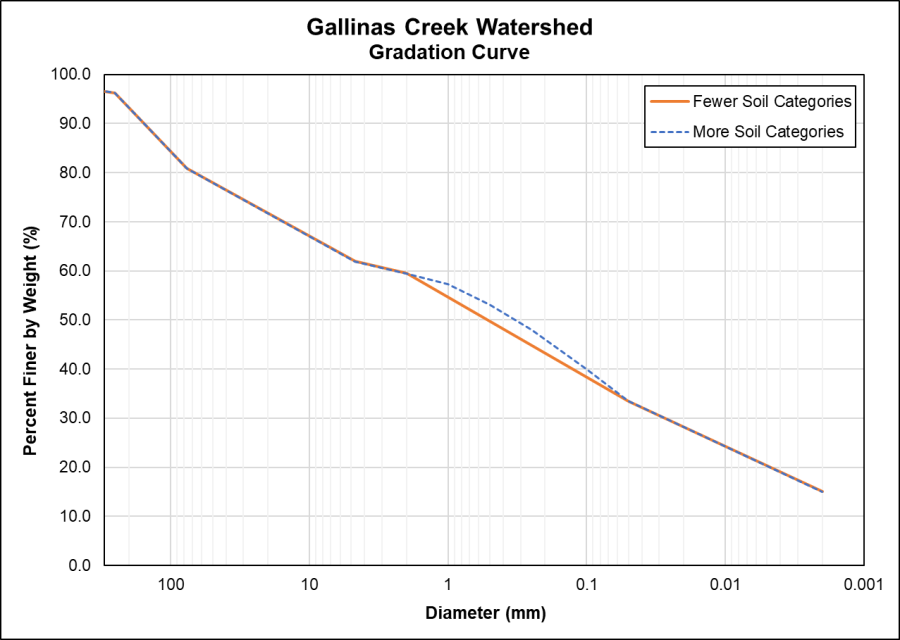 In this option, a single gradation curve representative of the Gallinas Creek Watershed soil conditions is developed using data from the Gridded Soil Survey Geographic (gSSURGO) database from the USDA-NRCS. ESRI ArcGIS Pro (version 3.0.2) and Microsoft Excel are used to complete this analysis. It should be noted that this gradation curve does not affect the computation of the bulk sediment discharge for each subbasin element. It is used to specify the proportion of the total sediment discharge to each grain size class, shown in the sediment load by grain class results. In this procedure, the gSSURGO data is sampled for the entire watershed to represent the subbasin elements. To apply this procedure to reach and reservoir elements, the gSSURGO data specific to those elements, rather than the entire watershed, should be sampled. However, the gSSURGO database is usually missing data for fluvial channels which may necessitate the collection of physical samples or other soil data.