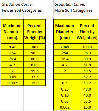 - Determine which soil categories to include in the gradation curve. In this case, two options are presented (fewer and more soil categories):