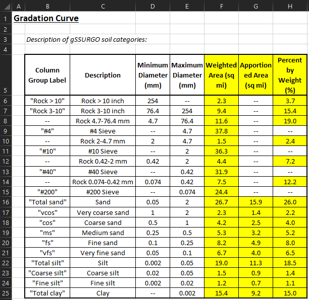 - Sum the weighted area for each soil category computed on the gSSURGO Data sheet in Column F on the Gradation Curve sheet.