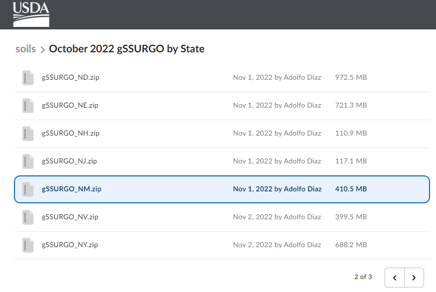 - Click on the State Databases - Soils link to download the gSSURGO database by state: https://nrcs.app.box.com/v/soils/folder/180112652169.