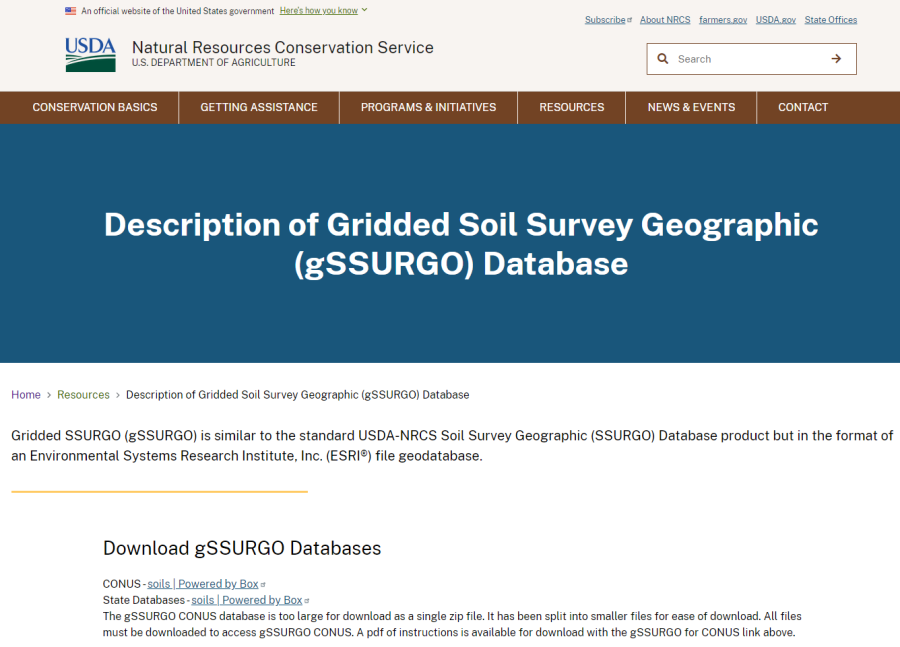 - Navigate to the USDA-NRCS gSSURGO database website: https://www.nrcs.usda.gov/resources/data-and-reports/description-of-gridded-soil-survey-geographic-gssurgo-database.