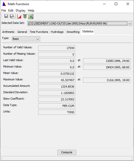 - Check the accumulated sediment yield amounts for J21 and RESERVOIR-SCS8 using the Tools>Math Functions >Statistics option.