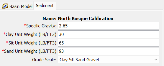 - Select the Sediment tab for the basin model. Keep default settings for the specific gravity and unit weights parameters.
