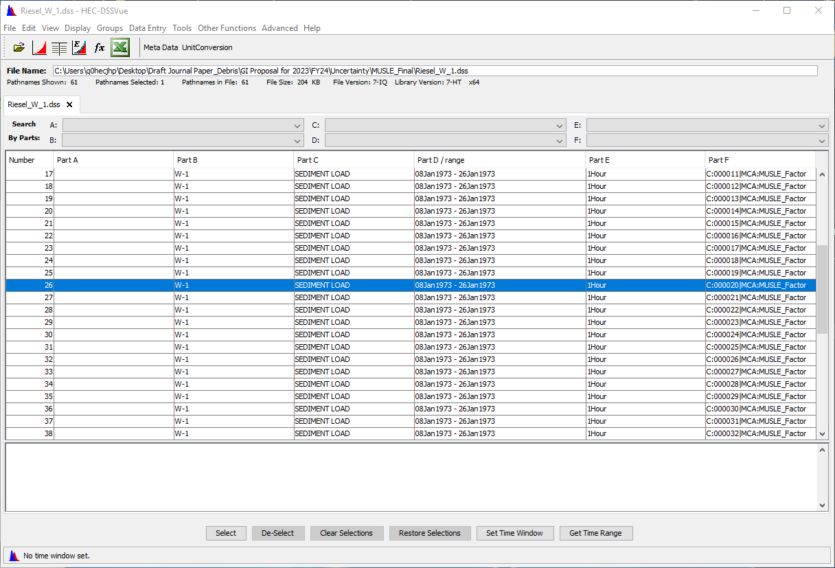 To view the timeseries output, head over to the project folder and open the Riesel_W_1.dss file. In the Part F, look for the position number. This record contains the timeseries sedigraph that computed the highest peak sediment load.