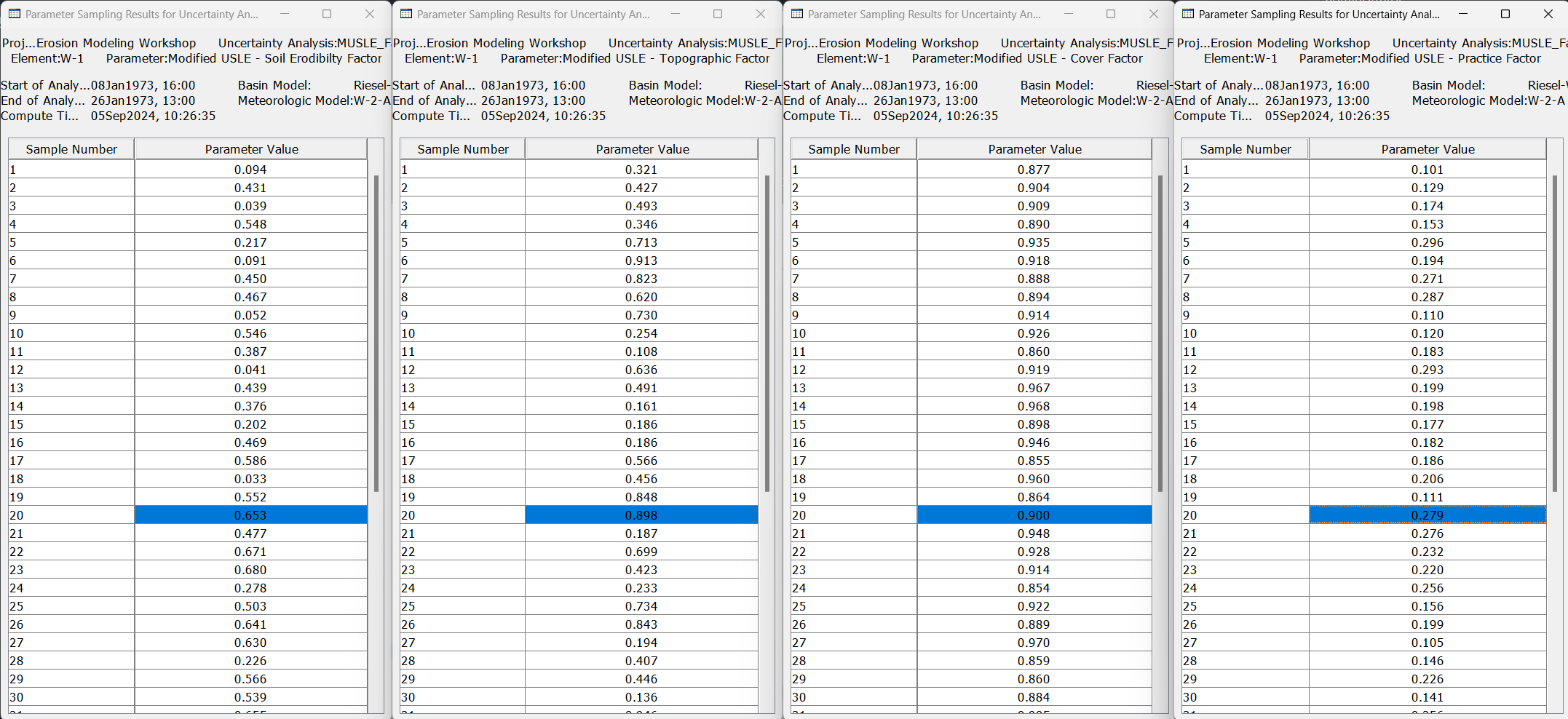 - Add parameters for the W-1 subbasin Modified USLE - Topographic Factor, Modified USLE - Cover Factor, and Modified USLE - Practice Factor. Make sure your parameter ranges won’t cause errors, such as a Max Deficit value less than the Initial Deficit already in the basin model. Example values are provided for you in the Table above. You should have a total of 4 Parameters