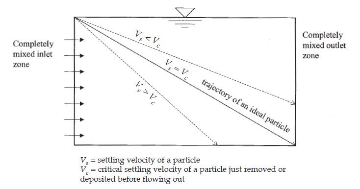 Camp (1945) conducted a study on sedimentation in an ideal rectangular continuous flow basin or settling tank, as depicted in Figure 1. This model assumes conditions of quiescent and steady flow, complete mixing of water and sediment, and no resuspension. When sediment flows into the tank, discrete particles settle with a settling velocity (vs), which varies with particle size. In an ideal setting, one can define a critical settling velocity (vc) for the pond. Particles with vs equal to vc settle in the pond just before they exit. This critical settling velocity depends on the water depth (d) and the time required for water to flow through the pond (T):