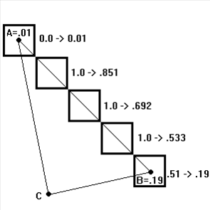 Below is an example of the calibration. To simplify the computations, consider the 5 grid cells evenly spaced along a line between A and B where the points A and B make up two of the corner points of a triangle of the precipitation TIN. The simplification comes from the fact that since the grid cells are precisely on a line between A and B, the third point of the triangle, Point C, has no weight.
