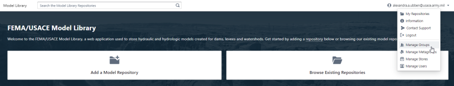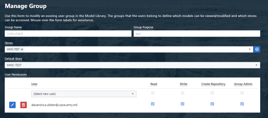 Group admins can manage group members and roles. From your username drop down, select Manage Groups. Browse to your group or use the filter search. Click on the pencil icon to edit the group. Group admins can add and delete users and set user permissions. Use the drop down to add new users and the pencil icon to edit user permissions.