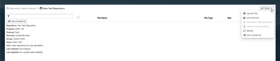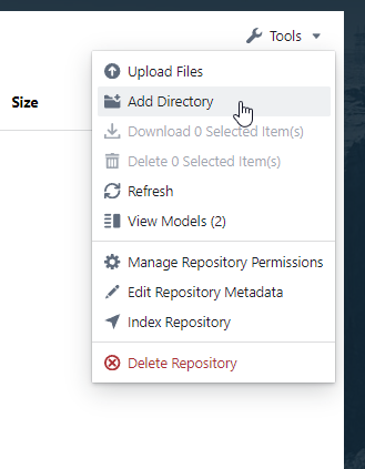 Browse to the repository, to upload, you must have write permissions to that group. Select the Tools drop down. Here you will find the upload file and add a directory tool.