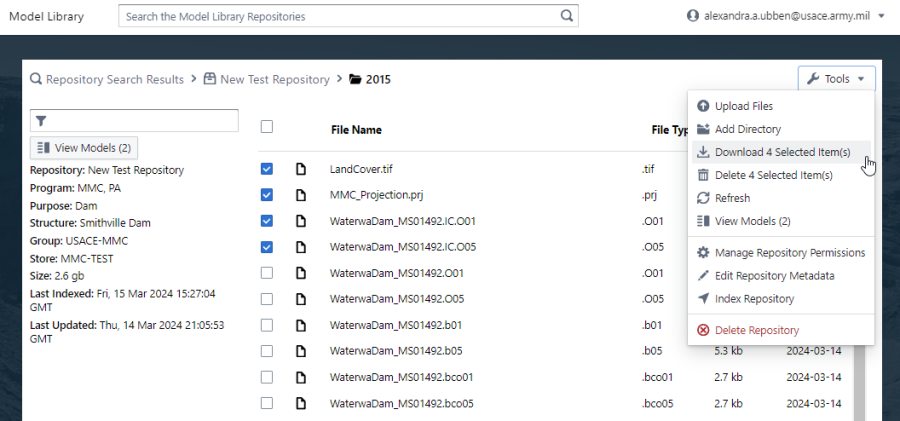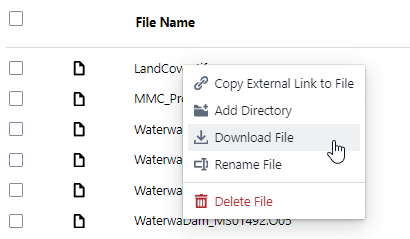 To download a file, either right click on the file name or select the file from the list and select download from the Tools dropdown. To download multiple files, select the checkboxes and use the download from the Tools dropdown.