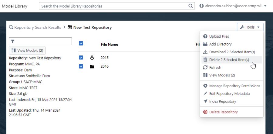 From the tools dropdown, a group admin can delete an entire repository or delete selected files.