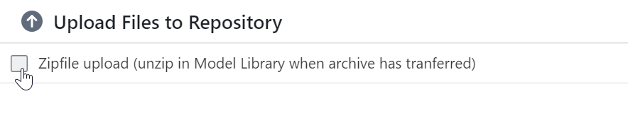 From the upload files tool, you can either drag and drop files or browse to the files. If you are uploading a *.zip file that you wish to have extracted once the file upload is completed you can check the box "Zipfile upload (unzip in Model Library when archive has transferred)". The zip file must be in zip format, 7zip format is not currently supported.