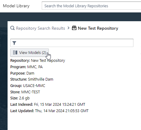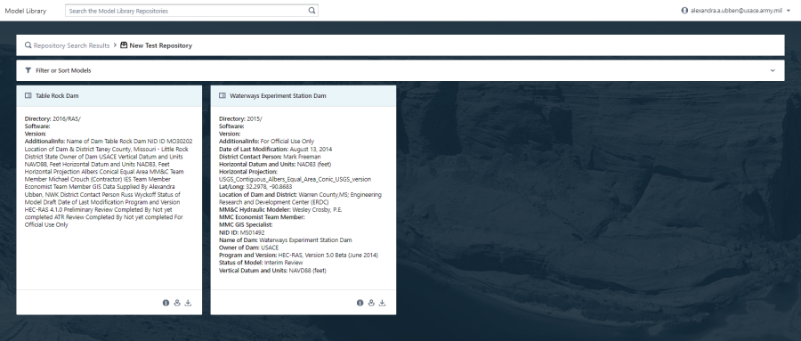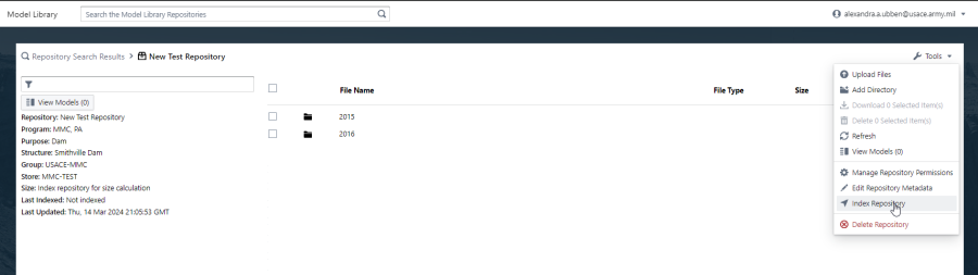 Indexing a repository allows for the model library to recognize any models within that repository and read model specific metadata. Currently, only Group Admins can index a repository. A repository can be indexed more than once as new models are added. From the tools dropdown, select "Index Repository" you will see a message that the index started. Refresh the view to see the now indexed models. Once a set of files has been recognized as a model, the count will appear in the View Models button it the upper left. Click on that button for model specific metadata and plan names. The model cards display the directory name and the metadata. From the card, you can download the model or view the metadata. The map feature is still under development.