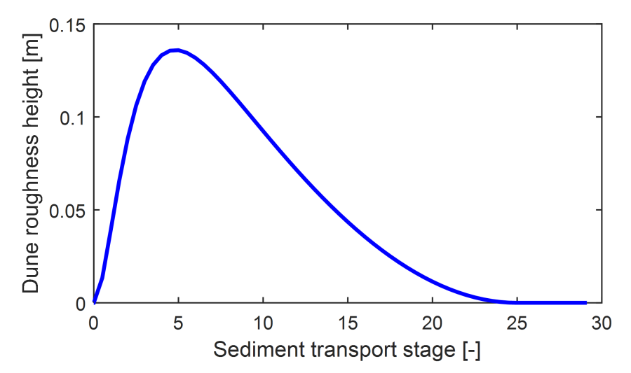 The dune shape coefficient, γd, is approximately 1.0 for dunes with angle-of-repose faces as considered in van Rijn (1984c). Dunes with more gently sloping faces have smaller shape coefficients as is common in the field. Van Rijn (1993) proposed setting γd = 0.7 based on various field measurements of river systems. van Rijn (1984c) provided expressions for calculating the dune height and length and are shown in Equations (2-94) and (2-95). The figure below shows the dune roughness based on van Rijn (1984c) as a function of the sediment transport stage.