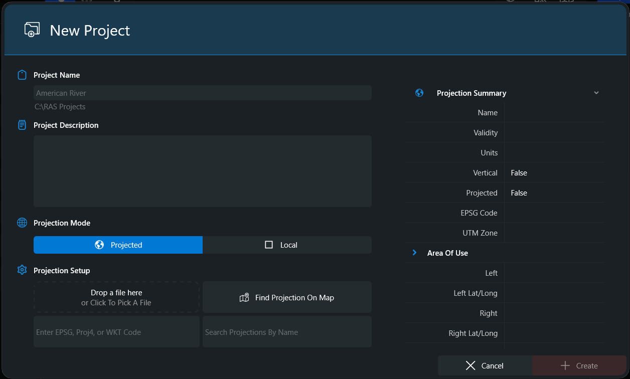 Spatial projections are foundational to many functions in RAS 2025, so we've added several new ways to set your model projection. Because projections are implicitly embedded in your model files (terrain re-projection, imported layer clipping, etc.), you cannot currently change your projection after the model has been created.