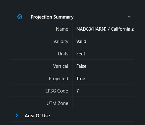 When you select a projection, you should confirm that the summary information makes sense for your data source. Note that our current alpha builds still have some issues identifying EPSG/UTM codes.