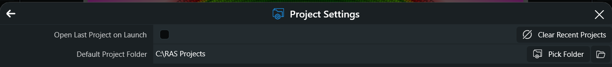 The RAS launch screen prominently features your most recent project, which you can click to launch. You can also scroll down from there for a chronological history of other projects you've worked on recently. The left side of the launch screen gives you options to create new or open existing projects, as well as a GIS-centric Scratch Project mode. The right side of the screen gives you more general information about RAS, settings and software updates.