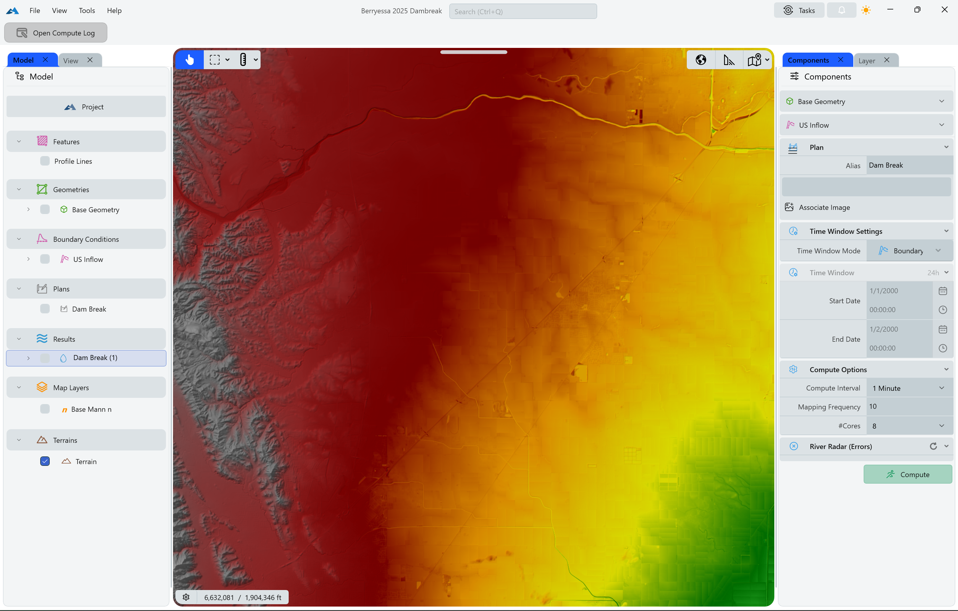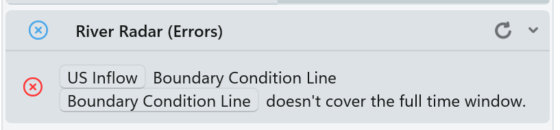 Any internal inconsistencies with a plan/geometry/boundary condition are routinely checked as you modify your model. These static errors are displayed in the Components pane, under the River Radar section. The most typical errors here are time window mistakes and missing data layers. Any data checking that requires external data sources (DSS flow data, terrain fully covers mesh, etc.) are checked at run-time after you click Compute.