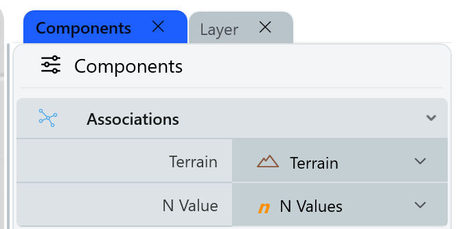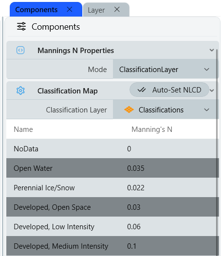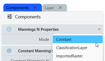 Like the terrain layer, adding an n value layer creates an empty bucket that can be modified in the Components tab. You must select between the 3 different modes provided.