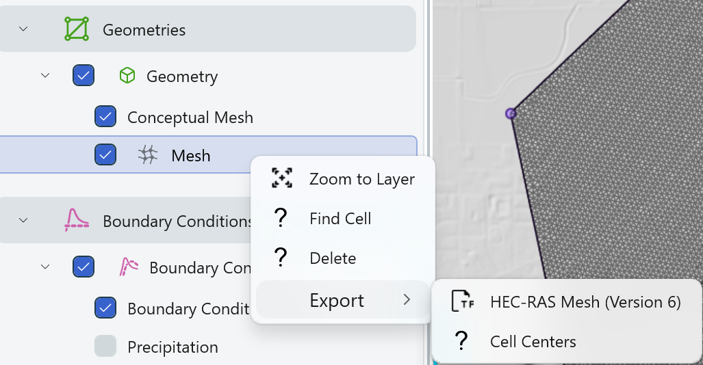 Opening a project file is supported for RAS 2025 projects (*.ras), but there is also an experimental RAS version 6 (*.prj) importer. This is a 'best effort' importer, which tries to convert geometry/boundary-condition/terrain inputs to their 2025 counterparts. The v6 importer will be expanded and improved over the coming years, and we'll highlight new feature support as it arrives. Note that v6 geometries cannot be run with the new solver, so their principle use is for visualization and vanilla GIS operations (copy river centerline as mesh arc, etc.). Any file that can be opened from the Open Project page can instead be dragged and dropped onto the interface.
