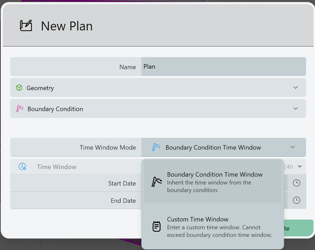 Plans use the time window from their associated boundary condition layer. In rare circumstances, it may be helpful to run a subset of the full boundary condition time window, i.e. 2 days of a 14-day event. If you need this for your model, you can swap the plan Time Window Mode to a Custom Time Window (shown in the figure below). The plan time window must be a subset of the full boundary condition layer time window, since this is the range for which you have asserted temporal data. If you change associated boundary condition layers, this may become invalid.