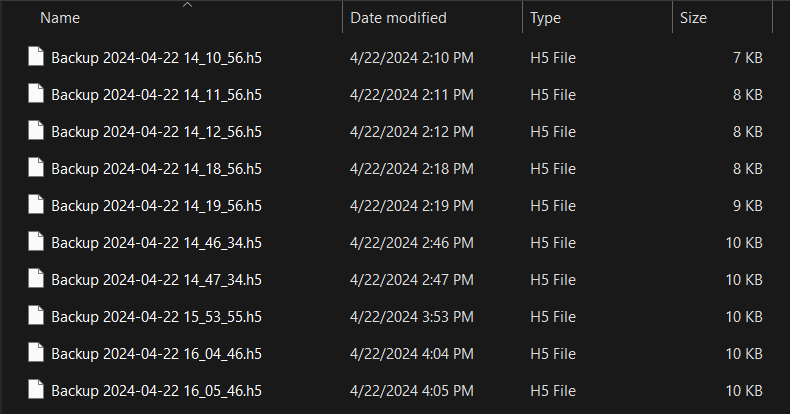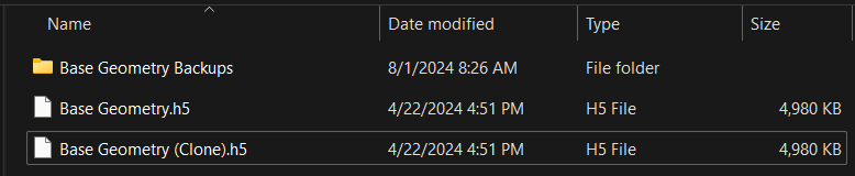Model file backups are stored in a folder next to that model file. For example, "Base Geometry.h5" will have an adjacent folder called "Base Geometry Backups".