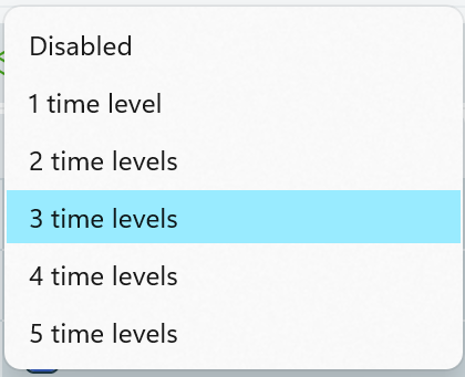 Local Time Stepping (LTS) is a technique to run constraining cells (smaller or faster-moving water) at a sub-timestep. If enabled, the selection of # time levels controls the ratio of the slowest to fastest cell in your domain. In our LTS scheme, adjacent cells can only change 1 LTS level from any neighbor, which represents a 2x or 1/2x sub-timestep change. If the most constraining cell in your domain needs a 1-second timestep, then a ratio of 3 time-levels (default) means that no cell in your domain can exceed a 4-second timestep (1, 2, 4 seconds). Increasing this value may speed up models with highly variable courant conditions, at the cost of extra solver book-keeping and some stability. (Note that 'variable' here means 'spatially variable', where different cells have starkly different courant conditions at the same model timestep.)