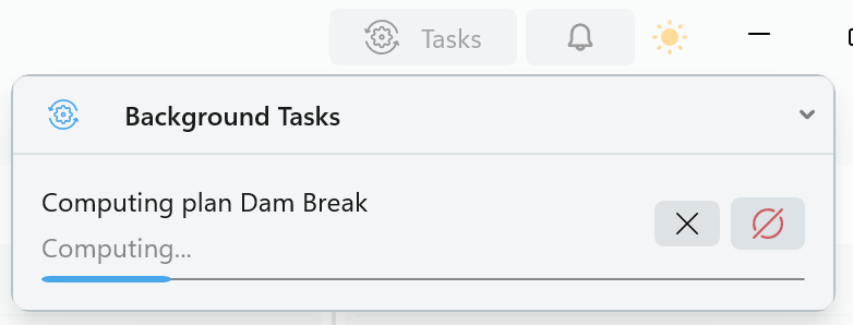 Tasks: The Tasks button gives you a summary of any ongoing, long-running tasks, with options to pause or cancel them. Hydraulic solvers, terrain imports, and map generation all emit tasks to this area.