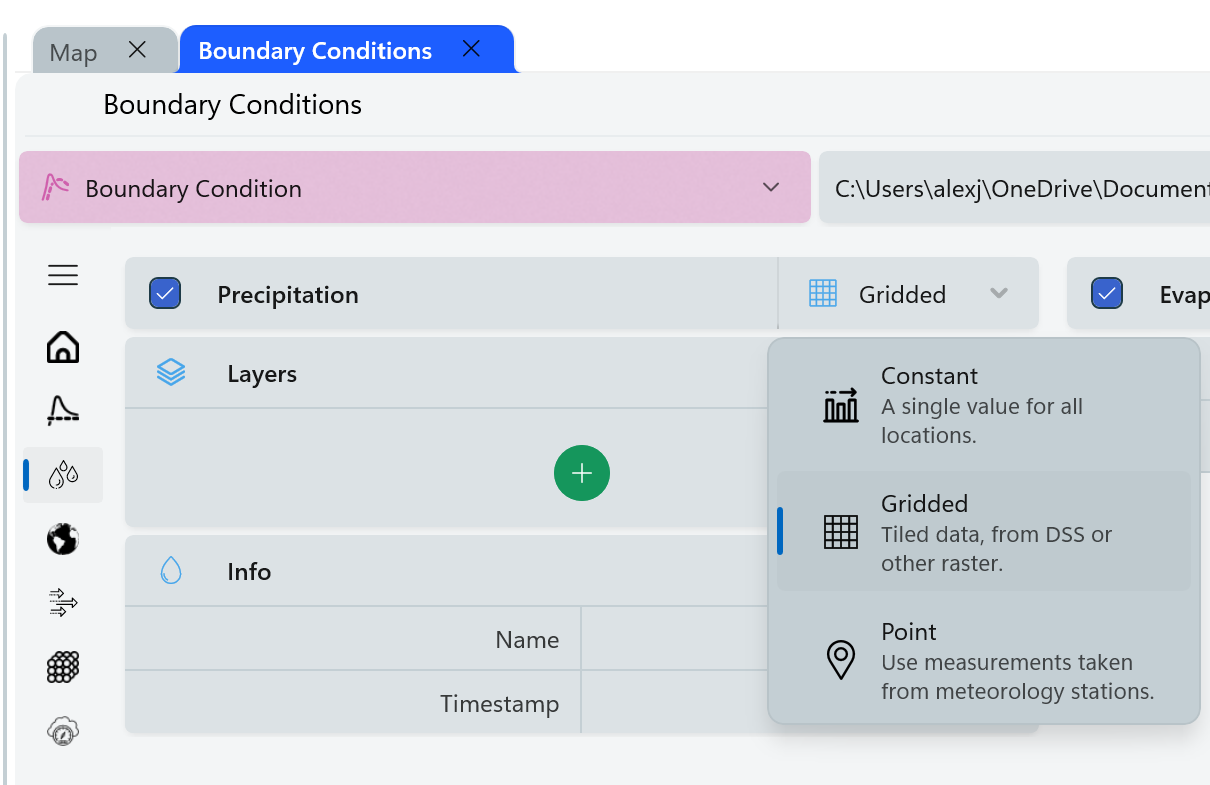 All spatial boundary layers can be viewed by enabling them in the Model pane, under their respective boundary condition layer. Temporal data can be manipulated with the Profile Slider at the top of the map window.