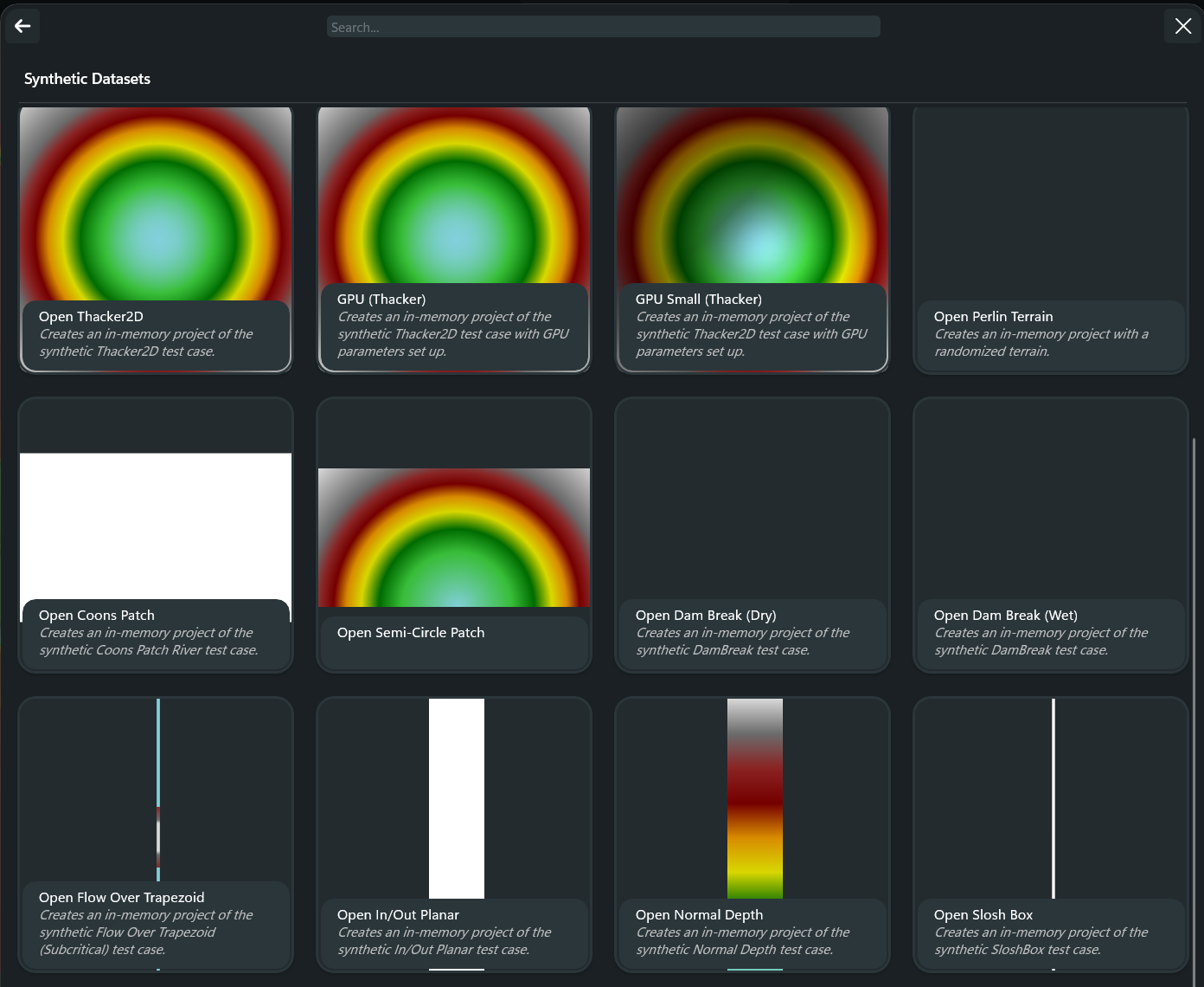 In addition to a growing list of example projects, we also have a collection of synthetic projects. Synthetic datasets are defined in-memory, and do not load or store to disk. They typically use functional terrain surfaces, and are simplified models designed to validate a specific feature of the solver. As such, they have certain limitations, e.g. you can't add new raster-based terrains to them. These can be powerful learning tools that are very easy to spin up and experiment with. Synthetic datasets are principally for internal testing and validation, but we're exposing them in the hopes that they can be useful to you as learning tools. Synthetic datasets are currently experiencing some instability, so look for them in a near-term build.