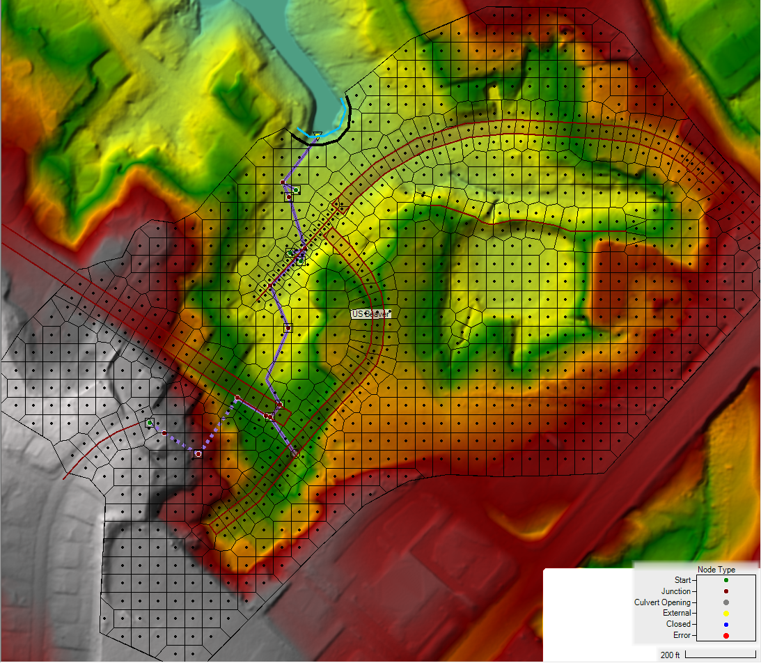 The catchment has some some steeper terrain, (~20% slopes) between terraces so the Pipe Network also contains conduits that are on the steeper side. The steep sloped conduits can require a much smaller timestep and increase the computation time. To avoid those issues, the steep conduits' Computation Method attributes were set to Instantaneous. The Instantaneous method simply transfers inflow from one end of the conduit to the other end without modeling it hydraulically. This allows the inflow from the drop inlets to enter the pipe system without hydraulic routing through the conduits themselves.