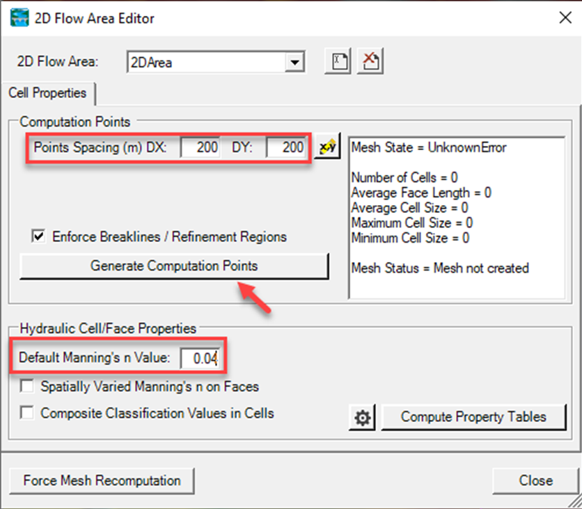 - Enter a point spacing in the 2D Flow Area Editor. Use “200”