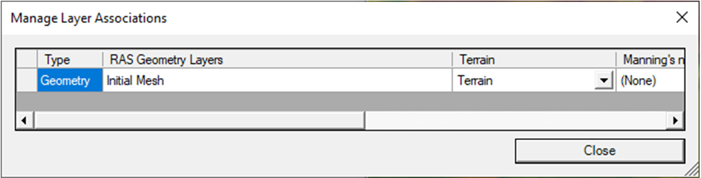 - The dialog to Manage Layer Associations will launch. The terrain you just made is automatically associated with the Geometry Layer you just made (because there are only one of each). This is what you want. So just press Close.
