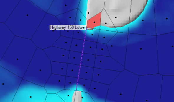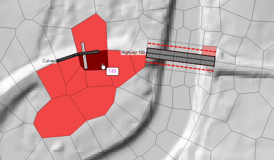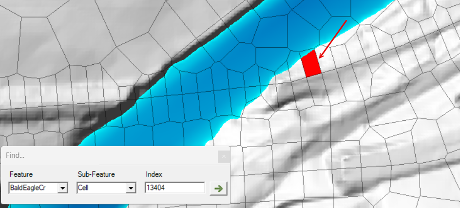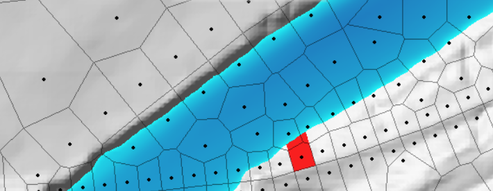 You can also see that there are two cells on the north side of the channel that do not have faces along the high ground of the levee. This is allowing water to pass through the levee and is a mesh development mistake.