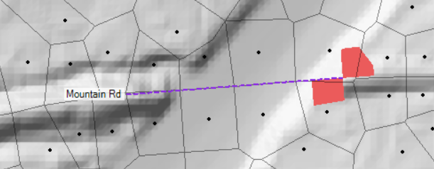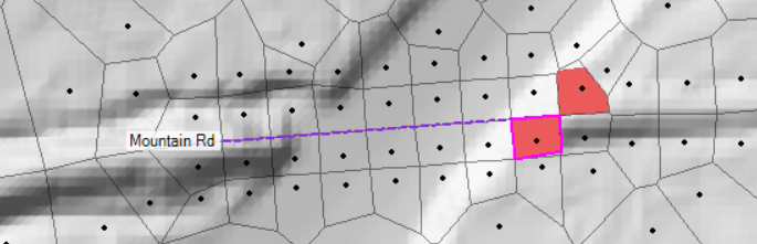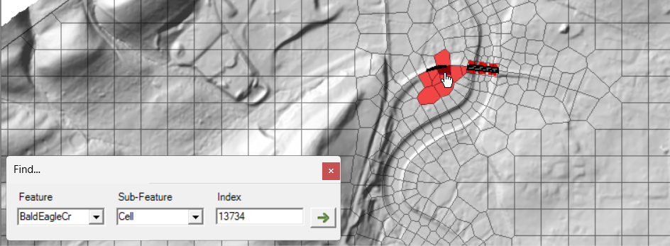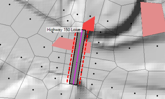 To fix this issue, the bridge needs to fully span to high ground. The bridge span was lengthened. The bridge was then enforced as a breakline and the points around the bridge were moved to create a good computational mesh. Shown below are the changes with the old cell's, that had errors, shown in red.