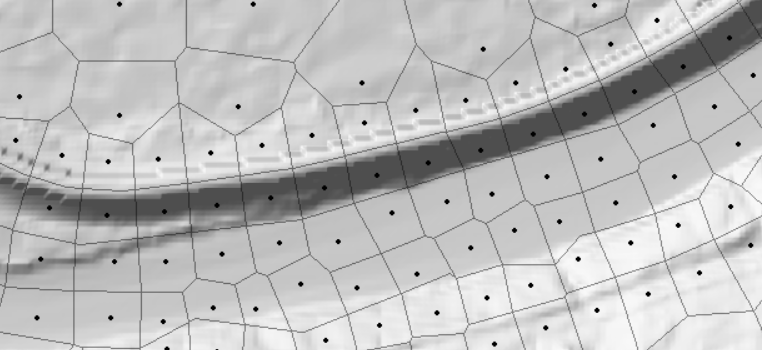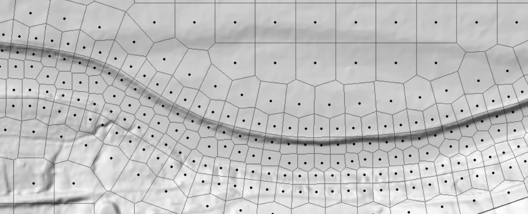 Channel cells were aligned with flow and small cells were removed. Leaky cells were fixed by aligning cell faces with high ground at the levee.