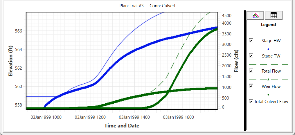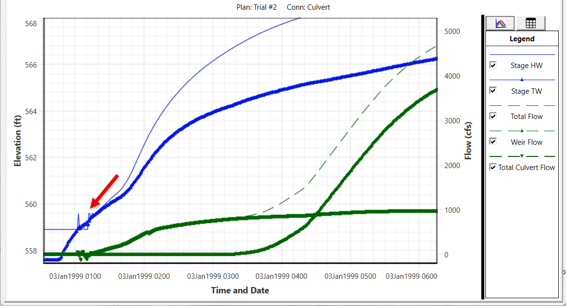 Using the hydrograph plot, you can see the culvert is unstable as it begins to flow.
